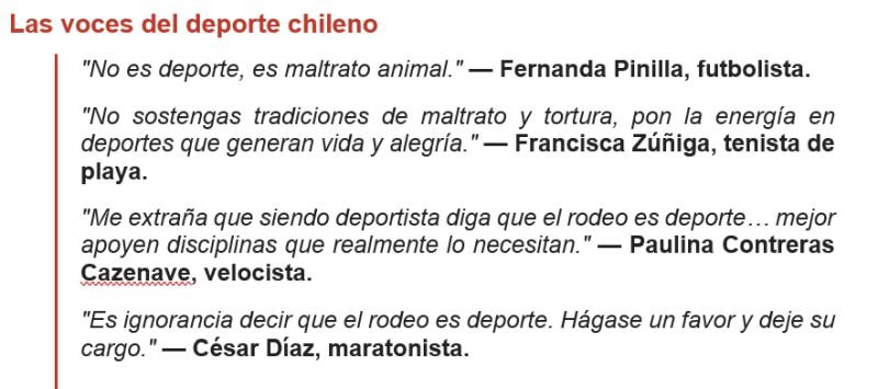 Tras el evento, la ministra publicó un mensaje en redes sociales destacando el valor del rodeo como parte de las tradiciones chilenas. La reacción no se hizo esperar: deportistas de diversas disciplinas respondieron directamente en los comentarios, cuestionando tanto la categorización de la práctica como el rol de la autoridad.